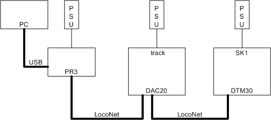 Connect up the LocoNet as shown: simply daisy chaining between the boards as required. Each board type will need its own power supply: connect DAC20 power feed to the "track" connections. The PR3 will also needa power feed - see its manual.