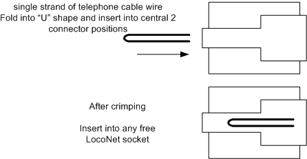 By far the easiest solution is to insert a “shorting plug” into any spare LocoNet socket. This is simply assembled by crimping a single strand of LocoNet telephone cable to join connectors 3 and 4 of the 6 connector plug: